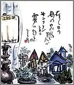 Hofmann’s worldwide wanderings reminded Jikihara of the mendicant, eccentric, sake-loving Zen monk Santoka Taneda (1882-1940) and he suggested they do a series of works based on the monk’s haiku. The 1988 Osaka exhibition of Hofmann’s 30 brush paintings, with Jikihara’s calligraphic rendering of the haiku interwoven into them was the first collaborative exhibition by master and student.[4] They later exhibited work together at the Gyokusei Museum, Awajishima[5] and at the Hakusa Sonso Villa in Kyoto. Toward the end of Jikihara’s life, Hofmann worked with him on large murals, often painting areas toward the top that his elderly teacher could no longer reach.[6] Hofmann also collaborated and exhibited Shigajiku, with Fukushima Keido,[7] the abbot of Kyoto’s Tofukuji Temple[8]