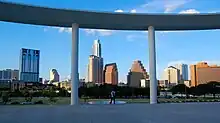 - City Terrace and Hartman Concert Park – A terrace located outside the Dell Hall looking onto Lady Bird Lake and Auditorium Shores. The City Terrace provides a panoramic view of downtown Austin while encircled by the “ring beam” from the old Palmer Auditorium. At the middle of the “ring beam” is a “compression ring” from the old Palmer Auditorium, which has been transformed into a bottom-lit, circular stage.