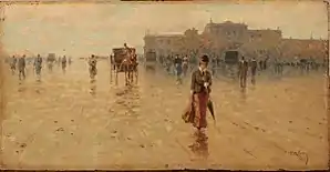 His most mature works, characterized by a smooth brushstroke and a robust and vibrant style, are from the early twentieth-century: he appreciated sad autumn atmospheres, gray skies, and cold windy days, which he portrayed with dim and melancholic tones. In 1901 he composed Donna a passeggio, in 1903 Paesaggio paludoso, in 1906 Via Libertà and Donna che raccoglie i fiori, in 1908 Scogli a riva, in 1910 Alberi a riva, Barche, Marina con scogli. Organized by Edoardo Alfano, he held a large personal exhibition in 1910 in Palermo where thirty-six of his works were presented. In 1911 he was awarded the gold medal at the National Exhibition of Rome for the picture Ultime foglie (Il viale della Libertà in una giornata di pioggia) of 1906.[3][4][5]