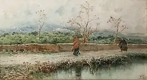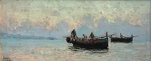 Soon however Catti tried, by writing to his father's influential friends, to re-establish contact with him and in the end some friends made him reconcile with his son.[8] Despite the fact that the relationship between the two remained difficult, his father arranged for his son to start working as a clerk at the court of Palermo. This work was a restraint for a bohemian like him. During this time he spent a great deal of time with Luigi Natoli, who encouraged him in his painting and introduced him to the Palermo salons of the wealthy Florio, Lanza and Trabia families and studios of the main artistic personalities of the time.[9] The young Michele Catti, brilliant and extrovert, gained the esteem of the painter Francesco Lojacono, the foremost Sicilian landscape artist in this period, who took him in as a pupil. Catti initially followed the lessons of the Lojacono with great enthusiasm and, distinguished for his talent and disposition, became his student. But tired of focusing on technical painting and the sensitivity of Lojacono, he soon moved on.[4]