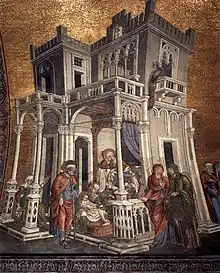 On the left vault in the Mascoli Chapel are two mosaics depicting the life of the Virgin, the Birth and the Presentation. The Birth panel shows “fanciful architecture, obliquely placed[9]” similar to the backgrounds found in art work by Gentile da Fabriano. A group of people stand at the front of the building and surround the infant child. The mosaic has elaborate decorative elements that give the appearance of "complexity and detailed observation".[9]