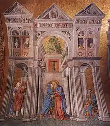 On the opposite side of the vault in Mascoli Chapel the life cycle of the Virgin is continued with the Visitation and Dornition of the Virgin. The style of these two panels differs from that used in the Birth and Presentation. As seen in the Visitation the building has several classical triangular shaped construction elements above horizontal structures with rounded arches and Corinthian capitals associated with the Florentine Renaissance style.[9] The facades are centrally placed and symmetrical and the three-dimensional structure is realistic.[9]
