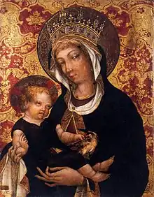 The figures are dressed in solid colors and are silhouetted against the brocaded textile in the background. The Virgin's angular facial features and serious expression contrast with the rounded features of the Christ-Child. The child is holding a goldfinch that represents a “premonition of the Passion".[11] The richly decorated velvet background features pomegranates, a fruit closely “associated with blood, death and resurrection”.[11] Textiles featuring pomegranate fruit in the pattern were widely adopted by Italians and are typically found in ecclesiastical and courtly depictions. Giambono was among the first Italian artists to use the iconographic meaning of these textiles in a Christian context.[11]