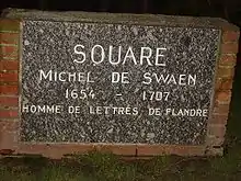 The French Flemish "Michiel de Swaenkring"[9] (Michiel de Swaen circle) has been named after him. In Duinkerke (Dunkirk) a street and a secondary school "Le Collège Michel de Swaen" have been named after him and in Nieuw-Koudekerke, there is a Michiel de Swaen Square.
