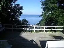Michillinda Lodge also accommodates weddings and receptions, the former on a deck overlooking Lake Michigan and the latter in a wedding tent on its lawn.[25] By 2012, the Lodge was hosting roughly 35 weddings annually.[5] Additionally, the Lodge hosts other types of gatherings, such as reunions, meetings, and parties.[5][7][20] Before the destruction of the main lodge, meals were served in its dining rooms,[26] and public dining that attracted a number of local patrons was also offered.[5] However, after the Lodge's restaurant was lost in the fire,[27] it simply recommends local restaurants to its guests.[28]