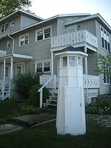 Constructed in either 1904 or 1909,[7][11] what would eventually become the main lodge was built as the vacation home of C. R. Stephens of Moline;[11] it was erected using balloon construction, along with a wooden truss roof and asphalt shingles. The four-story building, which the Stephens family christened "Lover's Lane,"[12] measured 13,000 square feet (1,200 m2) and, in its final configuration, featured 18 guest rooms as well as a kitchen and a pair of dining rooms with a capacity of 200.[8] In 1920, Whitehall resident Emanuel "Manny" Duttenhofer purchased this building, which was one of the two largest summer homes at Michillinda.[5] Initially, he intended to make it a summer retreat for his family, but after the unexpected death of his wife he instead used it to host friends and relatives. Shortly thereafter, he opened the building as a public resort and christened it the Michillinda Beach Tavern. In 1933, the resort was renamed Michillinda Beach Lodge to differentiate itself from alcohol-serving saloons, many of which renamed themselves "taverns" after the repeal of the Eighteenth Amendment to the United States Constitution. During their ownership, Duttenhofer and his sisters helped to develop Michillinda into one of the area's most frequented resorts, and the increased demand necessitated the construction of a two-story, 10-room Annex.[4]