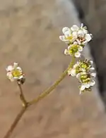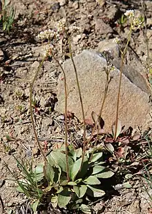 Micranthes aprica is a species of flowering plant known by the common name Sierra saxifrage. It is native to the high mountains of California, including the Sierra Nevada[1] and the southern Cascade Range, and adjacent slopes in southern Oregon and western Nevada. It grows in mountain habitat in areas of alpine climate, such as meadows and next to streams of snowmelt. It is a perennial herb which spends most of the year in a dormant state in order to save water, and rarely flowers.[2] It produces a small gray-green basal rosette of toothed oval leaves up to about 4 centimeters long. When it does bloom, it sends up an erect inflorescence on a peduncle several centimeters tall topped with a cluster of flowers. Each flower has five sepals, five small white petals, and a clump of whiskery stamens at the center.