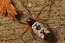 Micrathena mitrata, the white micrathena, is a species of orb weaver in the spider family Araneidae. It is found in a range from the United States to Brazil.[1][2][3][4] The spider has a distinctive appearance with a shiny, black abdomen and spiky, yellowish-brown legs. Its body length ranges from 4 to 9 mm in females and 3 to 4 mm in males.[5][6] The species is known for its elaborate web, which it uses to capture insects for food. Despite its fearsome appearance, Micrathena mitrata is not considered dangerous to humans and is generally regarded as a harmless spider.[6]