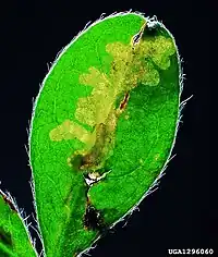 The larvae feed on Chamaecytisus hirsutus, Cytisus scoparius, Cytisus sessilifolius, Genista germanica, Genista sericea, Genista tinctoria, Laburnum anagyroides, Lembotropis nigricans, Lupinus and Petteria ramentacea. They mine the leaves of their host plant. The mine starts as a starlike, lobed blotch on top of the midrib. It develops into an upper-surface blotch that occupies almost the entire leaflet. The colour is light green at first, but soon turns brown. Almost all frass is ejected out of the mine. The larva may leave the mine and start mining elsewhere. Pupation takes place outside of the mine.[2]
