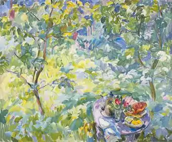 Created in 1982, the painting depicts the summer garden at a Dacha in Berngardovka, near Leningrad, the location of Antipova's main workshop during the years 1980–2000.