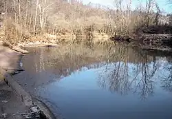 Middle Island Creek's most extreme meander forms a peninsula known as "the Jug," located upstream of Middlebourne. The creek rounds a 7-mile (11 km) bend[3] only to return to within 100 feet (30 m) of itself. Sometime prior to 1800, a settler named George Gregg had a mill race carved across the narrow point of the peninsula and harnessed the resulting hydropower for a gristmill and sawmill. These were destroyed by a flood in 1852, while later mills were subsequently built and also washed away by floods. In 1947 the West Virginia Conservation Commission constructed a low water bridge which substantially dammed the cut-through and restored a steady flow to the bend of the creek.[6] The land encircled by the creek's loop is operated as a Wildlife Management Area by the state of West Virginia.[9]
