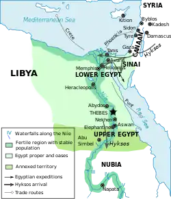After the initial dynastic chaos, a series of longer reigning, better-attested kings ruled for about fifty to eighty years.[67] The strongest king of this period, Neferhotep I, ruled for eleven years and maintained effective control of Upper Egypt, Nubia, and the Delta,[69] with the possible exceptions of Xois and Avaris.[70] Neferhotep I was even recognized as the suzerain of the ruler of Byblos, indicating that the Thirteenth Dynasty was able to retain much of the power of the Twelfth Dynasty, at least up to his reign.[70] At some point during the 13th Dynasty, Xois and Avaris began governing themselves,[70] the rulers of Xois being the Fourteenth Dynasty, and the Asiatic rulers of Avaris being the Hyksos of the Fifteenth Dynasty. According to Manetho, this latter revolt occurred during the reign of Neferhotep's successor, Sobekhotep IV, though there is no archaeological evidence.[71] Sobekhotep IV was succeeded by the short reign of Sobekhotep V, who was followed by Wahibre Ibiau, then Merneferre Ai. Wahibre Ibiau ruled ten years, and Merneferre Ai ruled for twenty-three years, the longest of any Thirteenth Dynasty king, but neither of these two kings left as many attestations as either Neferhotep of Sobekhotep IV. Despite this, they both seem to have held at least parts of Lower Egypt. After Merneferre Ai, however, no king left his name on any object found outside the south.[72] This begins the final portion of the Thirteenth Dynasty when southern kings continue to reign over Upper Egypt. But when the unity of Egypt fully disintegrated, the Middle Kingdom gave way to the Second Intermediate Period.[73]