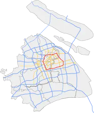 Middle Ring Road (simplified Chinese: 中环路; traditional Chinese: 中環路; pinyin: Zhōnghuán Lù) is a ring expressway in Shanghai, China. It is the second smallest in a series of four ring expressways around the city of Shanghai. Construction began in April 2003 on the first section of the Middle Ring Road in Yangpu District. The Middle Ring Road crosses the Huangpu River twice through the Jungong Road Tunnel and the Shangzhong Road Tunnel. On the Pudong side, the southern section from the Shangzhong Road Tunnel to Shenjiang Road opened on 25 December 2009.[1] Most sections of the ring road are elevated. However, some sections passing through the Changning, Minhang, and Yangpu districts run at-grade and utilize Texas U-turn interchanges with the expressway running in a trenched underpass.