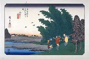 Utagawa Hiroshige's ukiyo-e print of Mieji-juku dates from 1835 -1838. The print depicts a placid view of Mieji, with two farmers stopping to give directions to a traveling priest. The thatched roofs of the post station can be seen beyond a marsh with groves of bamboo and a pair of blooming Camilla trees.