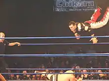 Quackenbush going for a high-angle senton bomb on the Great Sasuke