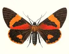 The forewings are identical to those of Milionia callimorpha, but broader, with the band narrower and, on the underside, abbreviated behind. The hindwings are short and rounded, with a yellow band as in M. callimorpha, but this band is not shaded with black on the underside. Furthermore, the third basal segment of the abdomen is all black, not yellow.[2]