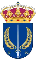 The coat of the arms of the Military Academy Karlberg (KS) 1977–1983, the Swedish Army Staff College (Arméns krigshögskola, AKHS) 1983–1994, the Military Academy Karlberg (KS) 1994–1999 and the Military Academy Karlberg (MHS K) from 1999. Blazon: "Azure, an erect rapier argent inside an open chaplet of laurels or. In field III and IV the year 1792 with two figures each field of the last colour".[8]