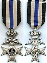 The Bavarian Military Merit Cross (Militär-Verdienstkreuz) was that kingdom's main decoration for bravery and military merit for enlisted soldiers. It was intended "to reward extraordinary merit by non-commissioned officers, soldiers, and lower-ranking officials."[1] It was originally established on July 19, 1866 as the 5th Class of the Military Merit Order, which was the main decoration for bravery and military merit for officers and higher-ranking officials. Civilians acting in support of the army were also made eligible for the decoration.