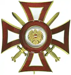 The Austrian Military Merit Decoration (German: Militärverdienstzeichen) was established 13 November 1989 to honor the Military of Austria.[3] The badge is a silver-gilt breast star which is worn on the left chest. The cross is 60 mm wide and high and in white enamel, with a red border. In the center is a gold medallion with the Austrian eagle. The cross has no inscription on the obverse, but on the reverse is inscribed Verdienst (Military Merit). Between the arms of the cross are gold crossed swords.[4]