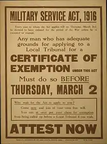 - ↑ The Military Service Act 1916 (Session 2), 6 & 7 Geo. 5 c. 15