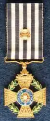 The Military Valor Medal (Portuguese: Medalha de Valor Militar) is a prestigious military decoration and the second highest honour in Portugal. Established on 2 October 1863, it is awarded for heroic deeds of extraordinary selflessness and bravery, or great moral courage and exceptional ability to make decisions, whether in war or peace, but always in circumstances where there is proven or suspected danger to life. The Medal is divided into three grades - Gold (Ouro), Silver (Prata) and Copper (Cobre). The award of the Gold Medal confers the entitlement to wear a fourragère.[2]