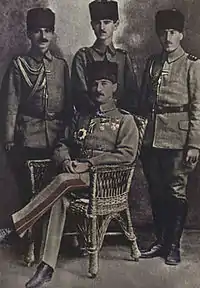 From left to right: Fuat (Bulca), Mustafa Kemal, German artillery advisor von Berk, Abdurrahim (Tuncak, adopted son)