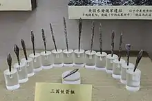 Weapons were largely the same as well, although there was more focus on idiosyncratic weapons wielded by particularly noteworthy individuals. For example, one man named Chen An apparently wielded a great sword over two meters in length[21] and Sun Quan's wife had over a hundred female attendants armed with daos.[22] Trends in warfare that had already been underway during the Eastern Han continued to gain momentum. By the end of the Three Kingdoms, the single edged dao, with its thicker and more durable dull side, had overtaken the straight double-edged jian as the primary close combat weapon.[23] The more expensive, lighter, and less durable jian entered the domain of court dancers, officials, and expert warriors.[24] While halberds were still used during the period, long spears and lances (similar to pikes) re-rose in prominence over halberds for infantry and cavalry forces. This was believed to have been the result of the long spear and lances' simpler construction, the adoption of long spears and lances by heavy cavalry to strike infantrymen, and the adoption of tighter infantry formations with less room for swinging and hooking [of halberds] in response to the greater threat by cavalry. [23][25] Soldiers in the northeast specialized in long spears.[26] After the Han dynasty, the crossbow gradually faded in importance until it made a mild resurgence during the Tang dynasty, under which the ideal expeditionary army of 20,000 included 2,200 archers and 2,000 crossbowmen.[27]
