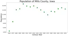 Mills County is a county located in the U.S. state of Iowa. As of the 2020 census, the population was 14,484.[1] The county seat is Glenwood.[2] The county was formed in 1851 and named for Major Frederick Mills of Burlington, Iowa who was killed at the Battle of Churubusco during the Mexican–American War.[3]