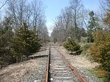 The Jersey Avenue Park & Ride station operated by NJ Transit (NJT) opened October 24, 1963 by the Pennsylvania Railroad and uses part of the old branch.[5][6] In an effort to cut costs, PRR merged with the New York Central Railroad to form the Penn Central Transportation Company (PC) in 1968. The Millstone Branch remained intact and active as far east as East Millstone to a rubber reclaiming facility located at the end of the branch until 1972 when the branch west of Clyde Road was abandoned. PC wanted to abandon the line but was required by federal law to serve any customers who wanted rail service regardless of profitability.[7] During the first six months of 1972, PC delivered only six carloads to the rubber factory, earning $1,383 in revenue; the cost to PC for making those deliveries was $3,862.[8] PC filed for bankruptcy in 1970, and sold all railroad assets to the new government-created Conrail (CR) on April 1, 1976. PC only sold the portion of the Millstone Branch up to South Middlebush Road to CR while retaining ownership of the South Middlebush Road–East Millstone section.