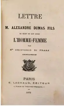- Lettre a M. Alexandre Dumas fils au sujet de son livre l'Homme-femme ("Letter to Mr Alexandre Dumas fils on the subject of his book l'Homme-femme"): Paris, 1872