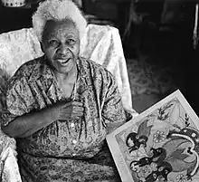 Evans began drawing on Good Friday 1935, where she finished two drawings using pen and ink "dominated by concentric and semi-circles against a background of unidentifiable linear motifs".[8] These two pieces were titled "My Very First" and "My Second," respectively.[9] From a young age, Minnie depicts her experiences of receiving visions and viewing mythical creatures that acquaintances could not.[10] Inevitably these visions circulated throughout her life as she started to hear and see more into her early adulthood. She heard a voice in her head that said 'Why don't you draw or die?'[5] After this, Evans did not resume drawing until 1940.[5] She started using pencil and wax on paper for her beginning works and she later worked with oil paints and mixed media collages.[1] Her subject matter were usually either biblical scenes or scenes from nature. Often, it was a mixture of both.[11] Her influences included African, Caribbean, East India, Chinese, and Western cultures.[1] Since she held the position as gatekeeper at the Airlie Gardens, she often used the gardens as her inspiration in her work to depict nature scenes.[1] If she wasn’t taking tickets, Evans was always off painting another vision inspired by her floral surroundings.[12]