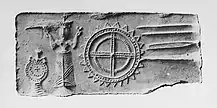 Similar comments have been made by Minas Tsikritsis in April 2011 in public.[8][9] He described together with Efstratios Theodosiou the smaller round image to the right of the female figure as a Minoan cosmology model with the planetary system above the Flat Earth, in which the cross that symbolises the sun is surrounded by 18 dots and those including the crescent-shaped moon symbol are surrounded by 28 dots, an indication hinting at the Saros cycle with 28 lunar eclipses in 18 years. This is approximately 30 millimetres (1.2 in) long and 62 millimetres (2.4 in) high.[10] They interpret the spoked disc on the other side of the female figurine, which is associated with Titaness Rhea, as a portable analog calculator, which was created 1400 years before the Antikythera mechanism.[10][9]