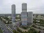 Clockwise from top: Cosmos Hotel, The main entrance to VDNKh, Residential complex Tricolor