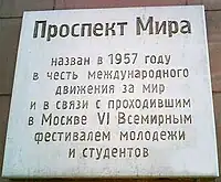 In 1949, 800 poplars were planted on the street. 1st Meschanskaya in 1957 was renamed Prospekt Mira to commemorate the 6th World Festival of Youth and Students, held in Moscow that year.[6] Also in 1957, the second Rostokinskiy bridge was erected.
