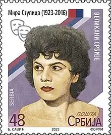 Miroslava "Mira" Stupica (Serbian Cyrillic: Мирослава Мира Ступица; née Todorović; 17 August 1923 – 19 August 2016) was a Serbian actress best known for her work in the theater, but also had extensive career on television and in films. Enjoying the enduring popularity for over 60 years and celebrated as the ‘actress of the century’ by her peers, she is considered one of the best Serbian actresses of all time.[1][2]