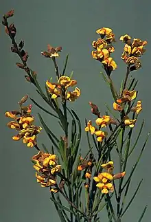 Mirbelia longifolia is a species of flowering plant in the family Fabaceae and is endemic to the south-west of Western Australia. It is an erect shrub that typically grows to a height of 0.6–2.4 m (2 ft 0 in – 7 ft 10 in) and has yellow or orange and purple flowers from September to October.[2] It was first formally described in 1942 by Charles Gardner in the Journal of the Royal Society of Western Australia.[3][4] The specific epithet (longifolia) means "long-leaved".[5] This mirbelia grows on stony soil in the Avon Wheatbelt, Geraldton Sandplains and Yalgoo bioregions of south-western Western Australia, and is listed as "not threatened" by the Government of Western Australia Department of Biodiversity, Conservation and Attractions.[2]