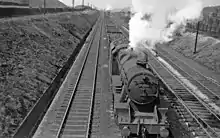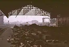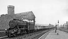The town received its first railway in 1840, when the Manchester and Leeds Railway opened the first section of its cross-Pennine main line between Normanton and Hebden Bridge (completing it through to Manchester on 1 March 1841). It did not actually get a station though until April 1845,[1] when the company opened one shortly before submitting plans to Parliament to build a branch line from the town along the Spen Valley to Bradford via Cleckheaton. Approval was granted for the route the following year and it was opened as far as Low Moor on 12 July 1848 and through to Bradford two years later. By this time further lines had been opened from nearby Heaton Lodge Junction to Huddersfield by the Huddersfield & Manchester Railway (opened on 3 August 1847) and from Thornhill to Leeds by the Leeds, Dewsbury & Manchester Railway (opened 18 September 1848).[2] The LNWR (which had absorbed both the H&M and LD&M by 1849) had originally planned to build its own route through Mirfield, but after negotiations with the Lancashire and Yorkshire Railway (successors to the M&L) agreed to not to go ahead in return for the granting of running powers over the Thornhill to Heaton Lodge section (and also allowing the L&Y access to Huddersfield). This meant that the railway passing through the town soon became extremely congested, carrying as it did the traffic on two main trunk routes between Manchester and Leeds (the Huddersfield & Manchester company having completed its route through Stalybridge in August 1849) and it led to the station gaining a notorious reputation for delays. This persisted even after the Heaton Lodge - Thornhill section was quadrupled in 1884,[3] and it was not until the LNWR opened an alternative Huddersfield to Leeds route at the turn of the century that the situation began to improve. To facilitate interchange, a new station was built 202 yd (185 m) to the east of the original; the contract for the station (excluding roof) was placed on 25 May 1864, the roof contract being placed on 26 April 1865. The new station centred on a large island platform with overall roof, and facilities included a hotel, buffet and billiard room; it opened on 5 March 1866.[4][5]