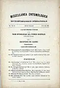 The first issue of Miscellanea Entomologica was published in a larger format (24 x 36 cm), but immediately the following ones were smaller (18 x 24 cm). The first year was published both in French and in German. The first issues consisted mainly of capture notes and announcements for the sale or exchange of insects.