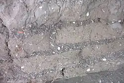Detail of the adobe walls of the mission: crushed shells are clearly visible