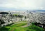 The Twin Peaks, icons of the San Francisco Bay Area, are also home to a reported population of Mission blue butterflies. The entire area is a park managed by the San Francisco Recreation & Parks Department (SFRPD). The park contains 31 acres (130,000 m2) of what the Park Department terms "Natural Areas." This area is most of the park minus roads, viewpoints and the City Fire Department reservoir. The natural areas contain significant resources for preservation. They include some of the largest areas of coastal scrub and prairie that remains within the city of San Francisco. These, being the preferred habitat of the Mission blue, are areas that support and provide habitat for the butterfly. Twin Peaks receives heavy recreational use because of its picturesque view of the city. Twin Peaks supports a wide array of habitat types, from mixed forest to coastal scrub. Among the coastal scrub and prairies are silver bush lupine plants (L. albifrons) which support the colonies of endangered Mission blues.[14]