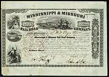 The Mississippi and Missouri Railroad (M&M Railroad) was the first railroad in Iowa. It was chartered in 1853 to build a line between Davenport, Iowa, on the Mississippi River and Council Bluffs, Iowa, on the Missouri River.[1] The railroad was the first west of the Mississippi river to join by bridge to the East. It played an important role in the construction of the First transcontinental railroad.[1] The competing Cedar Rapids and Missouri River Railroad actually became the first Iowa railroad to reach Council Bluffs from the Mississippi River. Thomas C. Durant, vice president of the Union Pacific Railroad, owned stock in both.