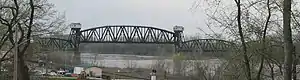 The bridge was built in 1931-32 as MKT Bridge No. 191.1 by the Missouri-Kansas-Texas Railroad to replace an 1873 MKT structure. It has four trusses over the water and a vertical lift in the middle, and was constructed by Kansas City Bridge Company (substructure), American Bridge Company (superstructure), and General Electric Company (electric installation).