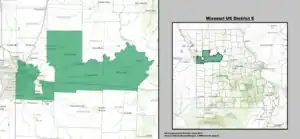 The district primarily consists of the inner ring of the Kansas City metropolitan area, including nearly all of Kansas City and some of its suburbs in Clay and Jackson counties, including North Kansas City, Gladstone, Independence, Lee's Summit, and some of Blue Springs. Before 2023, the district stretched east to Marshall and included Lafayette, Ray, and Saline counties.