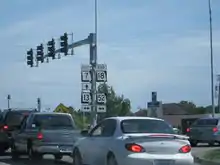 Route 18 begins at the Kansas state line just west of Drexel. It runs for three miles (5 km) along the Cass/Bates County line. Route 18 then turns south to Merwin, where it turns back east. It then runs through Adrian, before having a diamond interchange with the Interstate 49/U.S. Route 71 freeway.[1] Route 18 then runs south of Altona and through Ballard. It then runs through Clinton. Route 18 then ends at Routes 7, 13, and 52.