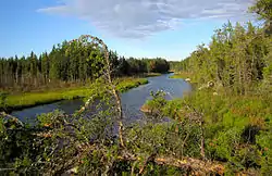 The remote creek flows through Churchill River Upland portion of the Midwestern Canadian Shield forests and is surrounded by mixed forest with stands of black spruce, white spruce, jack pine, and trembling aspen. The shoreline is characterized by steeply sloping irregular rock ridges and poorly drained areas of muskeg.[2]
