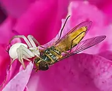 Crab spiders are carnivorous, feeding on invertebrate insects such as flies, bees, butterflies, grasshoppers, dragonflies, and hoverflies.[3][21] Bumblebees (Bombus appositus)[22] provide the spider with the most biomass, but small syrphid flies (Toxomerus marginatus) are the prey captured most frequently. Other frequently captured prey include honeybees (Apis mellifera) and moths.[21] Immature Misumena vatia commonly feed on smaller-sized prey such as thrips, aphids in the family Aphididae, and dance flies in the family Empididae. They may also use nectar and pollen as food sources when prey is scarce.[20]