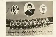 Fashions in Music was then signed to their first recording contract for "Row, Row, Row", which sold 50,000 copies soon after its release. Radio stations began playing the record, and the orchestra was in demand for appearances throughout the country.[1][2][5] In 1939, Bluebird Records offered the band an initial one-year contract; the arrangement lasted until 1942.[1][2][6] All the while, the orchestra continued to function as a company, with the musician shareholders discussing business matters and voting on them.[2] By 1940, the orchestra had its own show on CBS Radio.[7] Ayres and the band appeared in three 1940s films: Swingtime Johnny, Moonlight and Cactus, and Lady, Let's Dance.[8][9][10][11]
