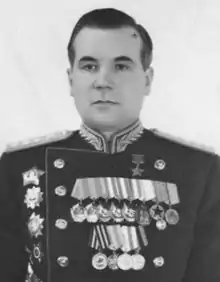 In 1946, after the end of the Second World War, Nedelin became chief of staff of the chief artillery directorate of the Soviet Army, and then chief of staff of artillery, and then deputy commander in chief of artillery. In 1948, he became head of the chief artillery directorate of the Soviet Army before becoming commander in chief of artillery from 1950 to 1952, and after a brief period as Deputy Minister of War, returned as commander in chief of artillery from 1953 to 1955.[1][2] From 1955, he was Deputy Minister of Defence, and concurrently from 1959 commander in chief of the Strategic Missile Force.[1][2]