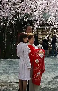 Miyamairi (宮参り, literally "shrine visit") is a traditional Shinto rite of passage in Japan for newborns. Approximately one month after birth (31 days for boys and 33 days for girls[1]), parents and grandparents bring the child to a Shinto shrine, to express gratitude to the deities for the birth of a baby and have a shrine priest pray for their health and happiness. The practice is similar to a Christian infant baptism.