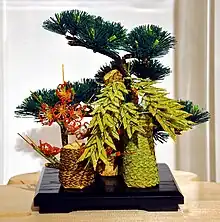 Mizuhiki (水引, lit. 'water-pull') is an ancient Japanese artform of knot-tying, most commonly used to decorate envelopes, called kinpū, which are given as gifts during holidays like Japanese New Year (and are then called otoshidama) or for special occasions such as births and weddings (shūgi-bukuro) or funerals (kōden-bukuro).[1][2] The colour of the cord depends on the occasion, or may signify the religious denomination of the giver at funerals.[3]